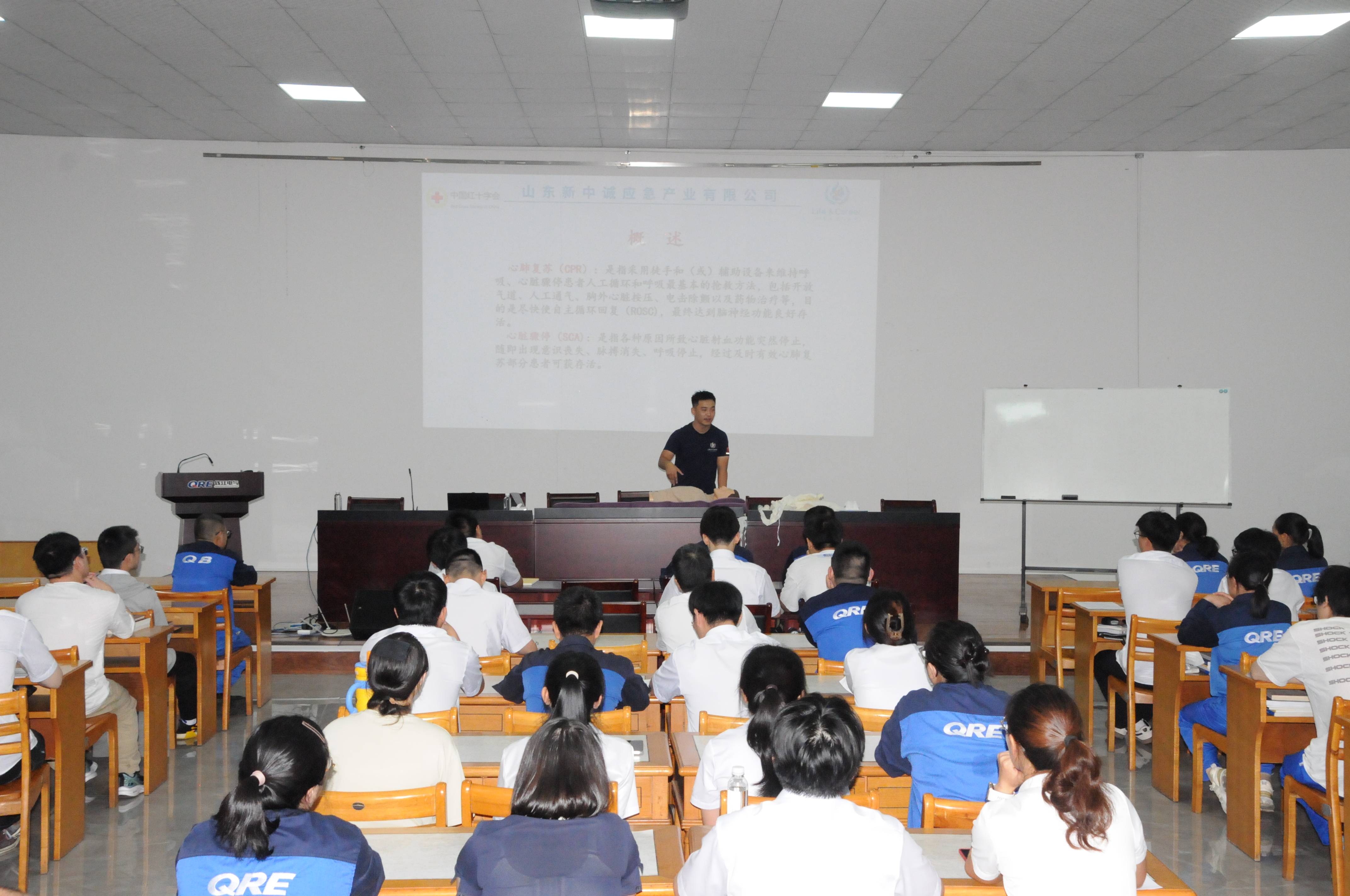 培训以保障生命安全为出发点,张老师首先讲解心肺复苏技能及相关要求,并进行现场模拟。他介绍,发现人员倒地昏厥,需先确认施救现场及周围环境安全,确保施救者自身安全;再通过拍打患者双肩并呼叫判断其意识,同时呼叫旁人协助;随后检查脉搏和呼吸,继而实施心肺复苏,等待 AED(心脏除颤仪)和救护车到来。讲解中,张老师结合视频播放与道具实操,生动演示抢救过程,诠释了以人为本、生命至上的理念。